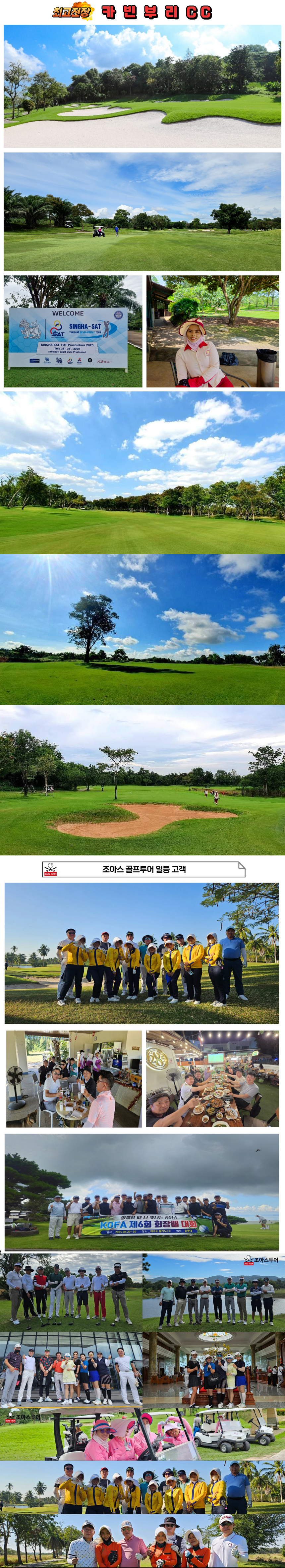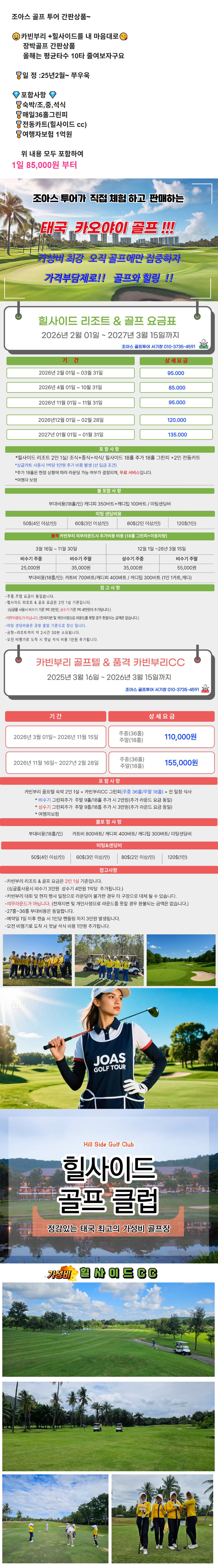 조아스 골프 투어 간판상품~ 😀카빈부리 +힐사이드를 내 마음대로😘 장박골프 간판상품 올해는 평균타수 10타 줄여보자구요 🎖일 정 :25년2월~ 쭈우욱 💎포함사항 💎 🎖숙박/조,중,석식 🎖매일36홀그린피 🎖전동카트(힐사이드 cc) 🎖여행자보험 1억원 위 내용 모두 포함하여 1일 85,000원 부터