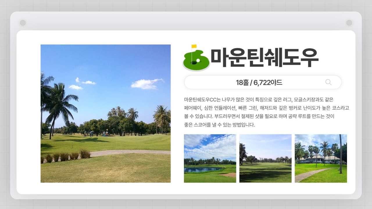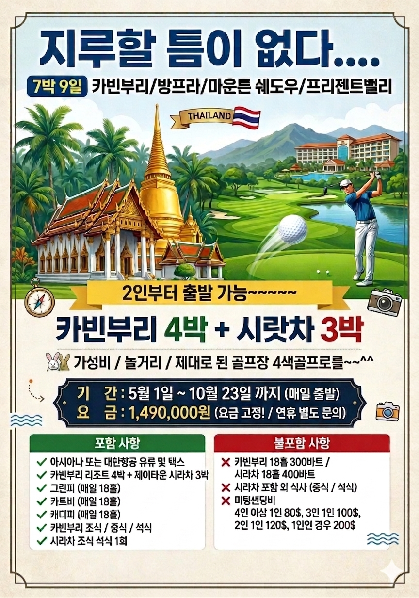 🔥 “7박9일 동안 지루할 틈이 없다” ⛳ 카빈부리 + 방프라 + 마운틴쉐도우 + 프리젠트밸리 👉 태국 명문 4색 골프 완성 ✔ 2인 출발 가능 ✔ 항공 + 숙박 + 라운드 + 식사까지 올포함+그린피+카트비+캐디피(매일 18홀) ✔ 가성비 + 놀거리 + 코스퀄리티 다 잡은 구성 💰 7박9일 1,490,000원 (요금 고정) 📅 5월~10월 매일 출발