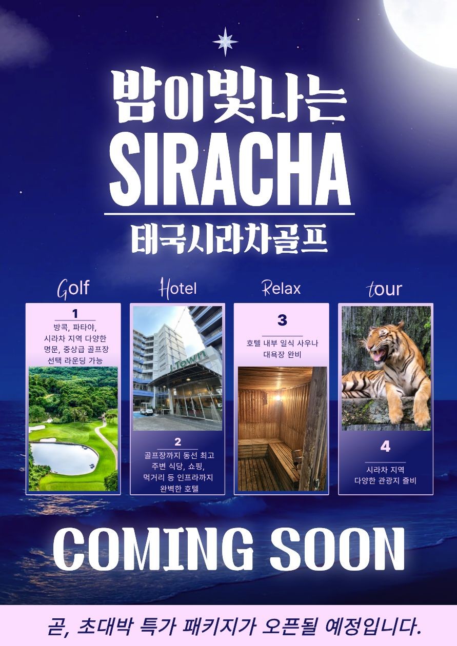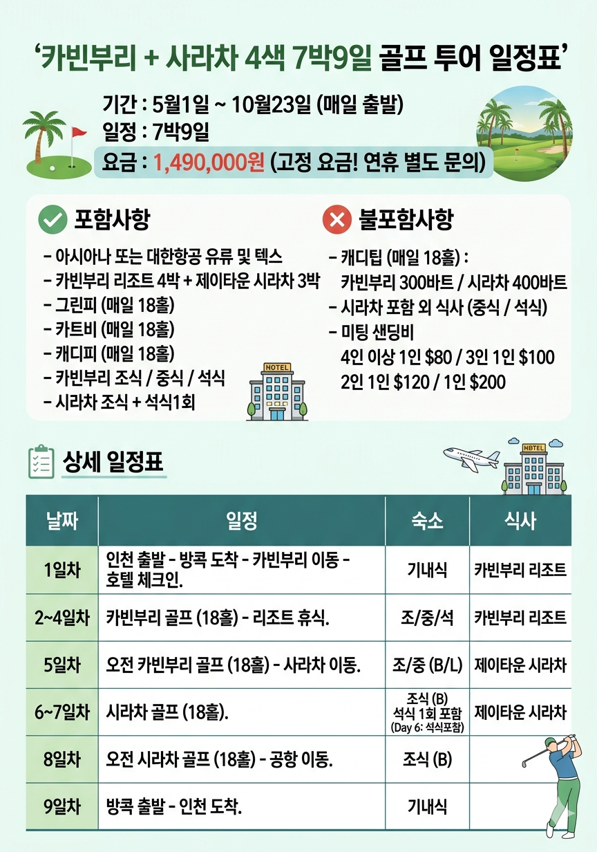 💎포함사항 💎 📍아시아나 또는 대한항공 유류및 텍스 📍카빈부리 리조트 4박 + 제이타운 시라차 3박 📍그린피 (매일 18홀) 📍카트비 (매일 18홀) 📍캐디피 (매일 18홀) 📍카빈부리 조식 / 중식 / 석식 📍시라차 조식 석식1회 ✒️불포함사항 ✒️ ‼️카빈부리 18홀 300바트 / 시라차 18홀 400바트 ‼️시라차 포함외 식사(중식 /석식) ‼️미팅샌딩비 4인이상 1인 80$ 3인 1인 100$ 2인 1인 120$ 1인인경우 200$