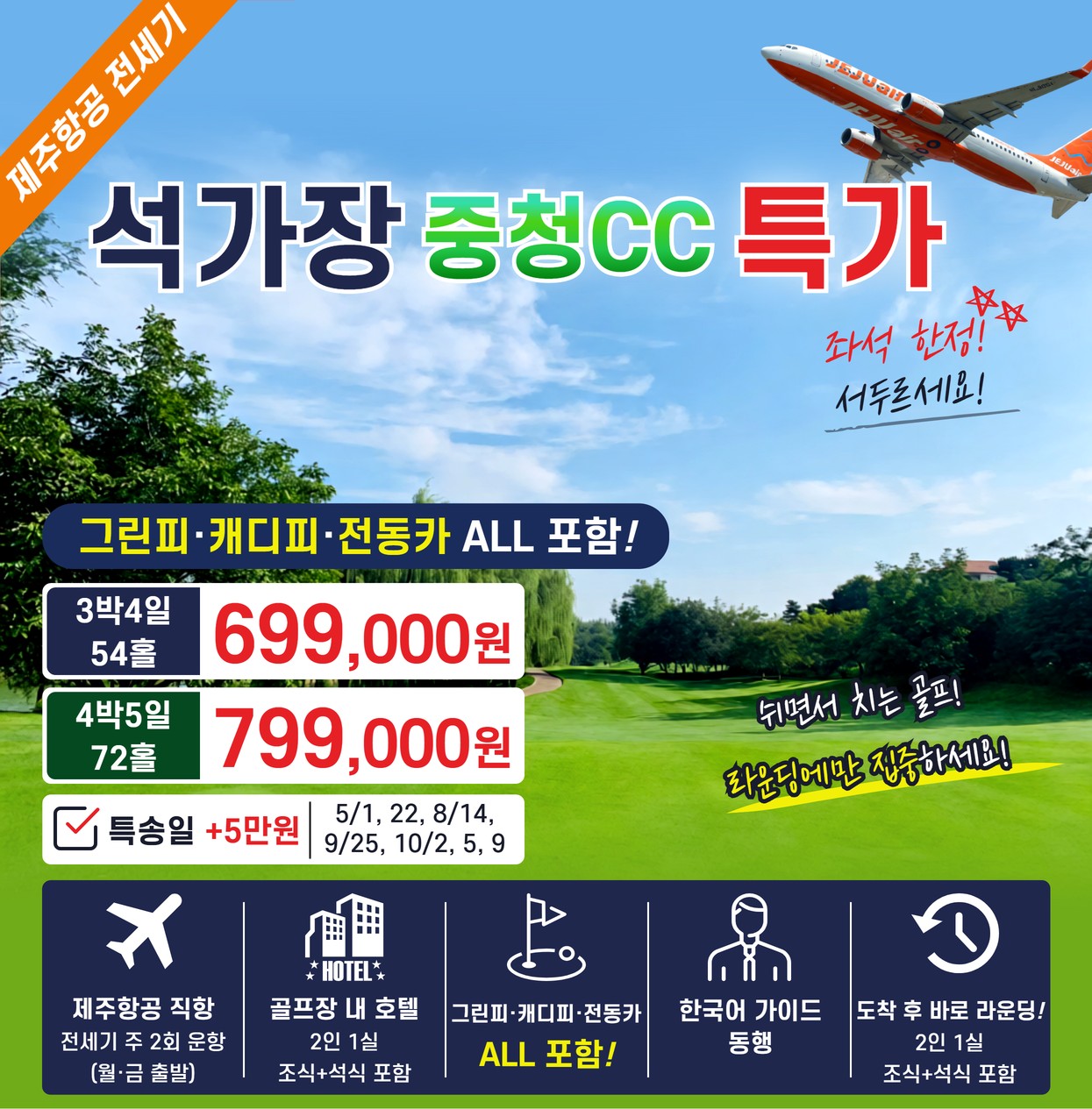 ✈ 제주항공 + 중청CC(그린피 · 캐디피 · 전동카) 특가